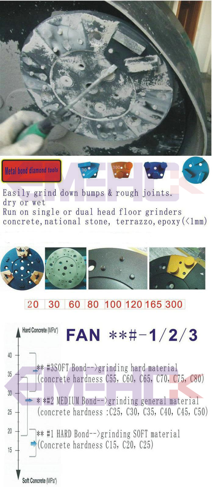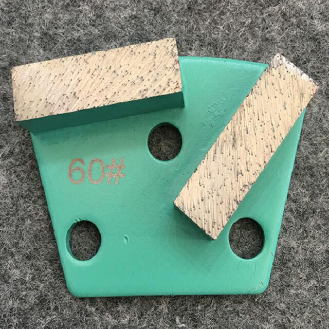 Trapezoid Diamond Grinding Shoes for Concrete and Terrazzo Floor Metal bond diamonds have high strength, excellent wear resistance, and a low friction coefficient. Metal bond diamonds high grinding efficiency and low grinding force generates less heat in the grinding process. Trapezoid Diamond Grinding Shoes are the best solution for large areas of thin coating removal, leveling and smoothing high spots in concrete, and work very well for concrete cleaning. Their segments are designed for aggressive grinding of concrete to make short work of your larger projects. These High Quality Diamond Grinding Tools are also ideal for the initial steps in concrete polishing procedures.